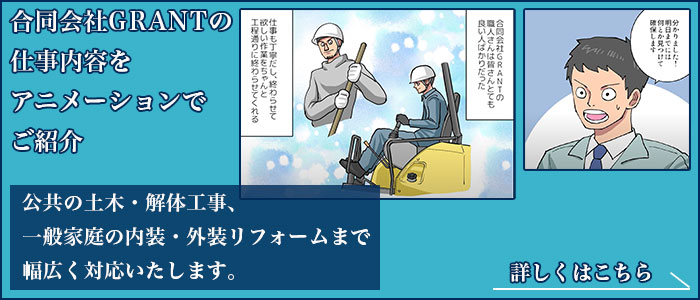 長崎県長崎市川原町にあります合同会社GRANTでは、公共の下水道・水道整備工事、道路改良工事、河川・海岸工事などの土木工事や解体工事を中心に行っております。