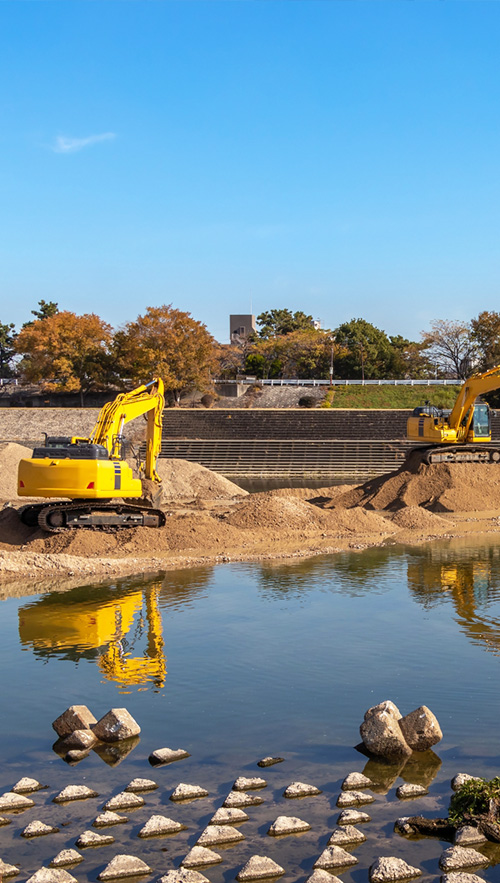 公共の下水道・水道整備工事、道路改良工事、河川・海岸工事などの社会の根幹を支える様々な土木工事や解体工事を中心に行っております。